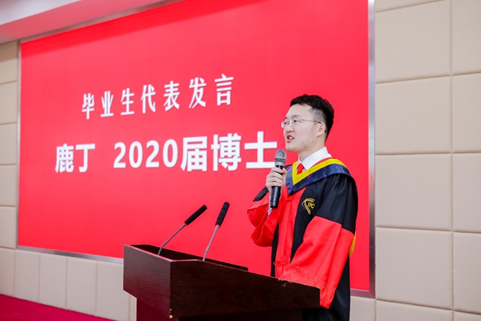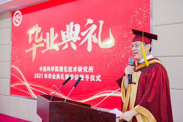 鹿丁博士代表2020届毕业生发言。他回顾了去年疫情时期的学位答辩和毕业情形,感谢所里为2020届毕业生提供参加典礼的机会。他谈及自己科研学习的初心,感恩老师们指路领航,让自己从一名学生成为现在留所工作的职工,从事相关科学研究和技术转化的工作,用自己的努力和成绩回答了“到中科院理化所来做什么?将来毕业后做什么样的人?”与所有毕业生共勉:青年人应于惊涛骇浪之中勇立潮头、急流勇进,方可见得云开日出之时。