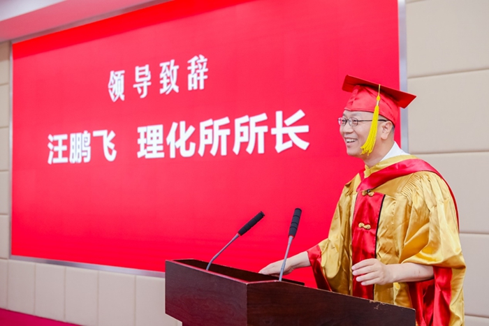 汪鹏飞所长亲切致辞,他回顾了三十多年前自己毕业时的简单情景,看到此时此刻隆重的典礼仪式及能与毕业生一起经历这一风光时刻,由衷地感到高兴和祝贺,祝贺同学们修成正果,顺利毕业,并感谢同学们为理化所科研事业的发展做出的贡献和努力。同时汪所长表达了对毕业生的殷切期望,希望同学们在今后的工作中做一个务实、自信、自立且有责任感的人,相信毕业生在今后的工作中一定会做出辉煌的成绩,撑起自己的一片天空。最后祝愿毕业生们前程似锦,常回理化所看看。