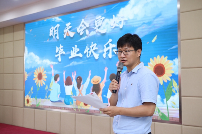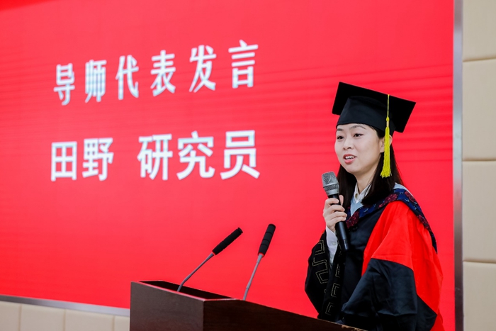 导师代表田野研究员分享了自己十年前毕业时的感受和经历,对即将踏入社会的毕业生悉心叮嘱:一是要学会乐观面对生活中的挑战,勇于承担责任;二是未来不管遇到什么困难,都不要放弃,乘风破浪,扬帆启航;三是保持学习的能力和习惯,不骄不躁、永怀希望。田野研究员为毕业生送上祝福:愿毕业生不负韶华,成为我们国家有担当有责任的中坚力量。
