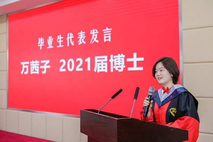 万茜子同学代表2021届全体博士毕业生发言。“桐花万里丹山路,雏凤清于老凤声”,她深切表达了对于理化所的感激之情,感恩求学路途所遇到的挫折与磨难带给自己日益坚韧的性格、坚定的内心和面对困难时的勇气与决心。愿每一位毕业生向100多年前的先烈们学习,不甘平庸,不畏牺牲,以坚定的理想和信念,谋求中国人民的幸福之路。在今天和平年代,踏踏实实走好每一步,只要无愧于心,无论走到哪里都是优秀的理化人。