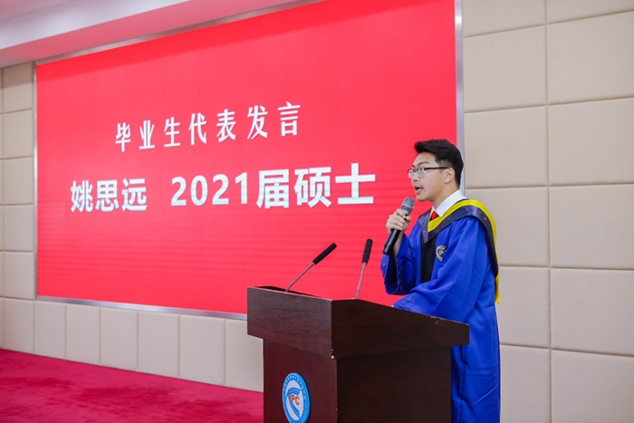 姚思远同学代表2021届全体硕士毕业生发言。他回顾了三年来自己的成长、度过的美好青春岁月,尤其表示在理化所学到的对待科研严谨沉稳的态度与厚积薄发的心性是受用终生的宝贵财富。毕业之际,希望同学们牢记习总书记对年轻人的期望——立大志、明大德、成大才、担大任,努力成为堪当民族复兴重任的时代新人,让青春在为祖国、为民族、为人民、为人类的不懈奋斗中绽放绚丽之花。在新的人生阶段书写新的篇章,开创新的时代未来。