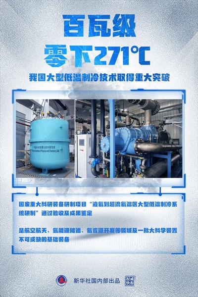 由中科院理化所承担的国家重大科研装备研制项目“液氦到超流氦温区大型低温制冷系统研制”于2021年4月通过验收及成果鉴定,标志着我国具备了研制液氦温度(零下269摄氏度)千瓦级和超流氦温度(零下271摄氏度)百瓦级大型低温制冷装备的能力。项目取得一系列核心技术突破,在应用和成果转化方面也取得重要进展,打造了“边研究、边应用、边转化”的发展模式。百瓦级大型制冷机成功实现应用,包括用于宁夏盐池液化天然气闪蒸气提氦项目、中科院高能物理研究所超导磁体测试平台,以及出口应用于韩国核聚变大科学装置(KSTAR)等,得到用户广泛认可,支撑了相关行业发展。