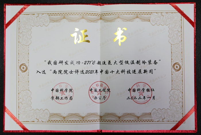 1月18日,由两院院士投票评选的2021年中国十大科技进展新闻、世界十大科技进展新闻揭晓。理化所成果“我国研发成功-271℃超流氦大型低温制冷装备”入选两院院士评选“2021年中国十大科技进展新闻”。
