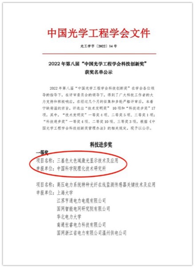 近日,2022年第八届“中国光学工程学会科技创新奖”获奖名单公布,由中科院理化所申报的“三基色大色域激光显示技术及应用”荣获科技进步奖一等奖。