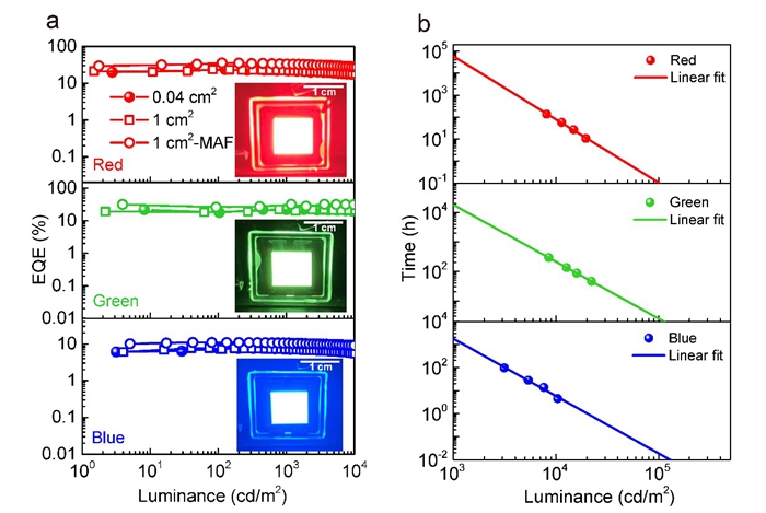 近日,中科院理化所光响应材料与器件研究中心的汪鹏飞研究员和王鹰研究员使用MoO3/SimCP2作为空穴注入层可以实现电极与4,4′-(环己烷-1,1-二基)双(N,N-二对甲苯)(TAPC)空穴传输层的欧姆接触,显著增加了空穴注入能力。实验表明,随着TAPC厚度的增加,薄膜的粗糙度呈现明显的下降;另一方面,对于像TAPC这种电荷迁移率(μ~10-3 cm2V-1s-1)相对较高的有机材料,只有在厚度超过900nm时才可以实现欧姆接触,而在厚度较薄时的注入势垒仍然不可忽略,对以往人们所认为的实现欧姆接触的策略进行了更正。在此基础上成功实现了厚度超过1μm且具有低工作电压的高效稳定的红、绿和蓝色OLEDs,器件最大外量子效率分别为23.09%、22.19%和7.39%,亮度在1000cd/m2时的驱动电压仅为5.11V、3.55V和6.88V,器件的LT95寿命分别为55000小时、18000小时和1600小时。该工作为基于OLEDs的大面积显示和照明设备的高良率铺平了道路。相关研究成果以Efficient and stable one-micrometre-thick organic light-emitting diodes为题发表于光子学领域权威杂志Nature photonics。理化所博士生刘冠豪和李志毅为论文共同第一作者,汪鹏飞研究员和王鹰研究员为共同通讯作者。