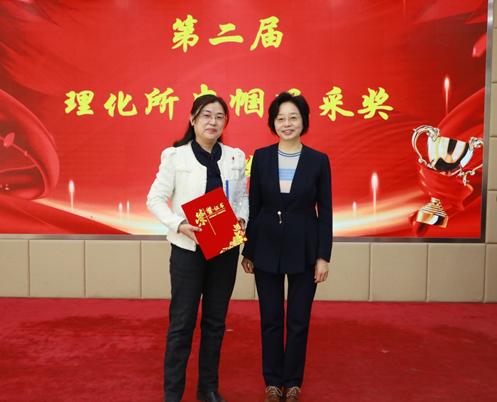 随后举行第二届理化所巾帼风采奖颁奖仪式。张梅英宣布了获奖结果,并通过视频短片介绍了王京霞、王格侠、李华、李嫕、高波等五位获奖者的优秀事迹。张丽萍书记为每位获奖者颁发了获奖证书和奖杯,并与获奖同志合影留念。