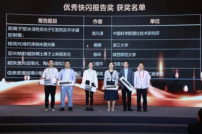 另外,研究生宾凡淳所发表的题为《阴离子型水溶性双光子引发剂及3D水凝胶制备》的快闪报告(指导老师:郑美玲 研究员),荣获2023中国光学十大进展高峰论坛暨颁奖典礼“优秀快闪报告奖”。