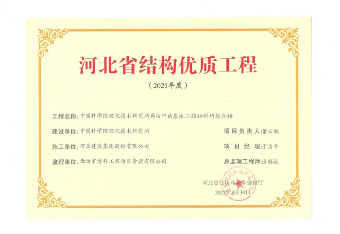 先进低温与微纳生物技术研发平台——廊坊园区4#科研综合楼建设项目列为中国科学院“十三五”科教基础设施项目,是由国家发改委批复立项建设工程,位于河北省廊坊经济技术开发区紫杉路(海棠路)29号,总建筑面积40000平方米。其中,地下一至三层为汽车库(人防工程)和设备用房,建筑面积13006.57平方米;地上八层为科研研究室及实验室,建筑面积26993.43平方米。荣获 “河北省优质结构工程(2021年度)”奖。