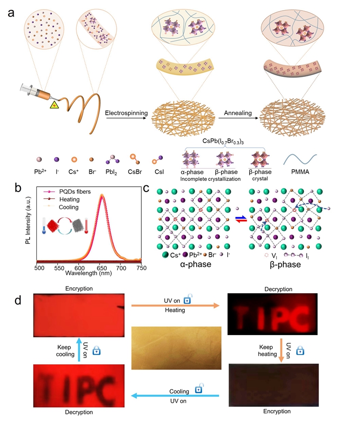 图1. a)原位静电纺丝和退火后处理制备CsPb(Br0.3I0.7)3 钙钛矿量子点@PMMA红光复合纤维的合成过程示意图,b)钙钛矿量子点纤维在加热和冷却之间的完全可逆PL光谱,c)通过α/β相变消除本征缺陷的示意图,d)双模加密。一个TIPC符号夹在两层钙钛矿量子点纤维膜之间,防伪标签的信息在日光和紫外光下都是不可见的。只能通过UV和温度变化的双重密钥来实现解密。图片来源: Adv. Funct. Mater.