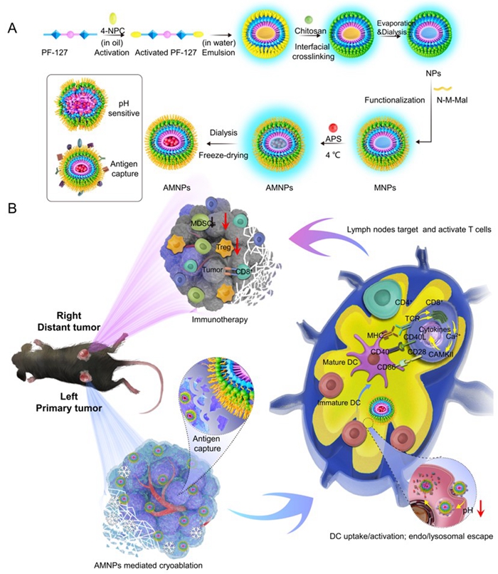 中国科学院理化技术研究所液态金属与低温生物医学研究中心与北京中医药大学东方医院联合团队长期从事冷冻消融治疗肿瘤的基础及临床研究,双方曾共同开展了国内外首台冷热复合治疗系统的临床实验,并基于“寒热理论”开展了肺癌冷消融生物热物理机制探索。在最新研究中,该联合团队总结了数十年冷冻消融临床研究,为促进和强化冷冻消融的“远端效应”,同时结合中药免疫佐剂特点,以中医肿瘤临床最为常用的补气药黄芪为切入点,设计了高效抓取冷冻消融后肿瘤原位碎片的纳米中药疫苗,提出了黄芪多糖纳米肿瘤疫苗与冷冻消融手术联合应用的癌症治疗模式。在这项工作中,该团队设计的黄芪多糖纳米肿瘤疫苗,通过表面修饰后可吸附冷冻消融后的肿瘤碎片(抗原),靶向呈递至淋巴结中,在树突状细胞内部通过pH响应释放肿瘤抗原及黄芪多糖以激活抗原特异性的全身免疫治疗(图2)。该方法除对局部肿瘤进行有效杀伤外,同时具有激活全身的肿瘤抗原特异性免疫、抑制远端及转移瘤体生长的重要作用。