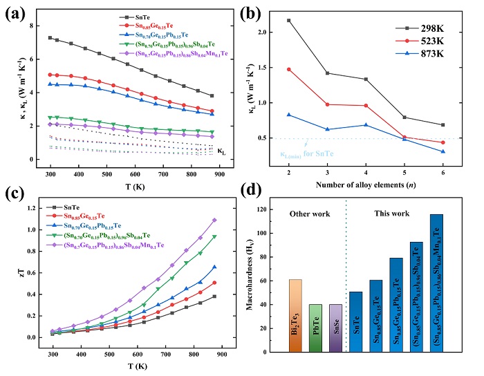 近日,中国科学院理化技术研究所低温材料及应用超导研究中心在SnTe热电材料中,使用Ge,Pb,Sb,Mn多重元素共合金化,在结构有序和无序之间得到平衡。多尺度层次结构使简单面心立方样品获得了低于无序界限的晶格热导率(0.3 W m-1 K-1)。中熵工程还促使能带汇聚,增加了能带有效质量,从而提高了功率因子。