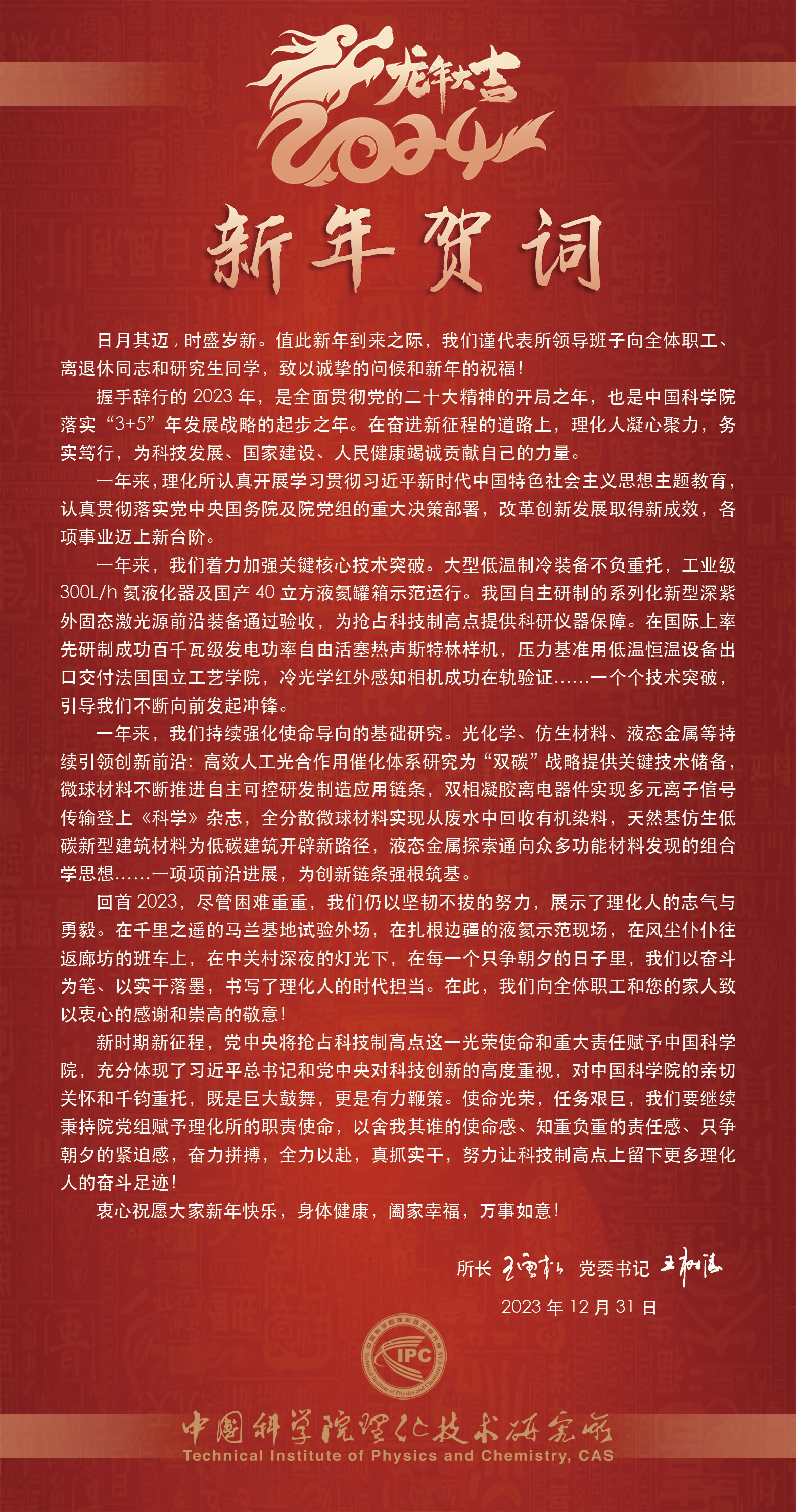 世纪更迭,创新潮起,中国科学院理化技术研究所应运而生。建所以来,理化所始终秉持中国科学院党组赋予的以高技术创新与成果转移转化研究为主的职责使命,深入推进物理、化学、材料、工程等学科间的交叉融合和高水平人才队伍培养和引进,形成了光化学转换与功能材料、低温科学与工程、功能晶体与激光技术、仿生超浸润界面科学与技术、特种功能材料与生物医用技术五大优势方向,为国家材料、能源、先进制造、生物医药等领域的战略需求提供了重要科技支撑,在光化学、仿生界面、低温科学基础及应用基础研究方面保持世界领先水平。