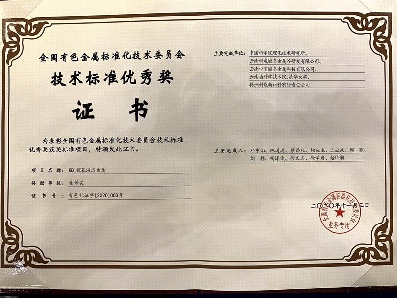 2017年,中科院理化所作为主起草单位提交了《镓基液态金属》国家标准立项申请,在国家标准化管理委员会关于下达2018年第三批国家标准制修订计划的通知(国标委发〔2018〕60号)中正式通过立项。2018年12月标委会组织召开任务落实会,组成了由中科院理化所牵头,云南科威液态金属谷研发有限公司、云南中宣液态金属科技有限公司、云南省科学技术院、清华大学等单位组成的编制组。在理化所研究员邓中山、云南液态金属企业负责人杨应宝的组织带领下,通过团队近两年的努力,该项国家标准目前已通过终审,预计于2021年初发布。