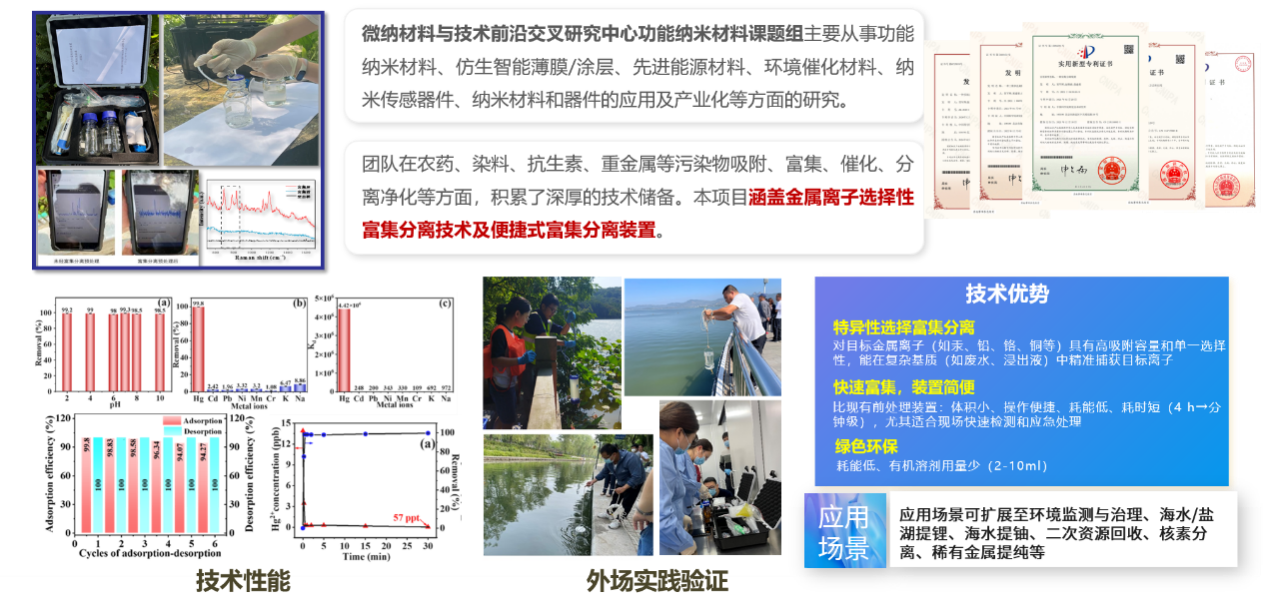 项目介绍:本项目涵盖金属离子富集分离技术及便捷式富集分离装置,核心技术在于重金属离子的快速高效富集分离。