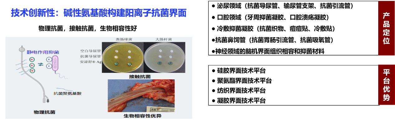 本团队基于碱性氨基酸,设计合成相关聚氨基酸抗菌材料,并利用表面涂覆或接枝等手段,将普通敷料表面功能化,赋予敷料表面抗菌性能,获得氨基酸医用抗菌敷料,解决“抗菌有毒”和“免疫原风险”的难题。该敷料在制备工艺上“绿色环保”,在水溶液中即可完成表面改性,有机溶剂使用量极低,产品化学残留低,且不影响原有敷料基材的透气和吸收性。在抗菌性能上,对临床院内感染常见致病菌的抗菌率均大于99%(依据ISO 22196或GB/T 20944.2)。在生物相容性上,细胞毒性不高于1级(依据GB/T 16886.5),无皮内反应和致敏性(依据GB/T 16886.10)。该技术成本低、也可以用于日常用品。