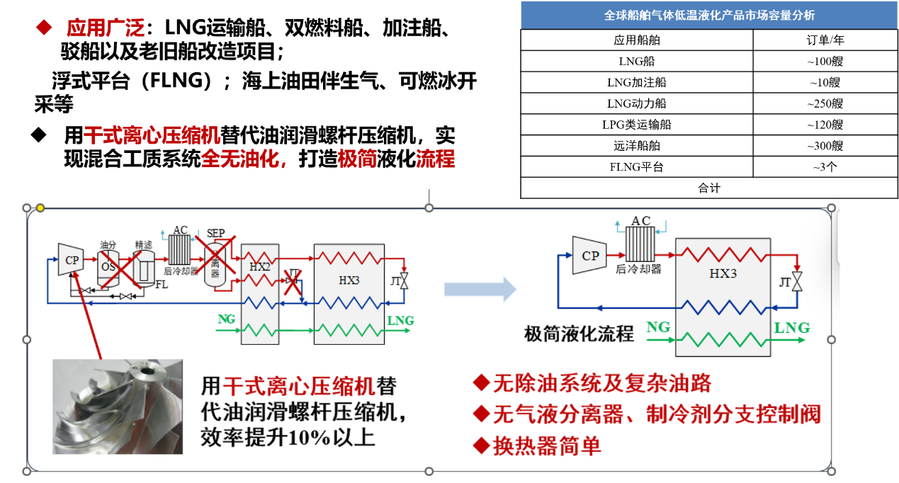 目前,理化所已经完成了基于油润滑螺杆压缩机驱动混合工质制冷的撬装液化技术以及氮/氦磁悬浮离心压缩膨胀一体机技术,其中陆用天然气液化已开展规模化的工程应用实施,船用液化技术正处于起步阶段。