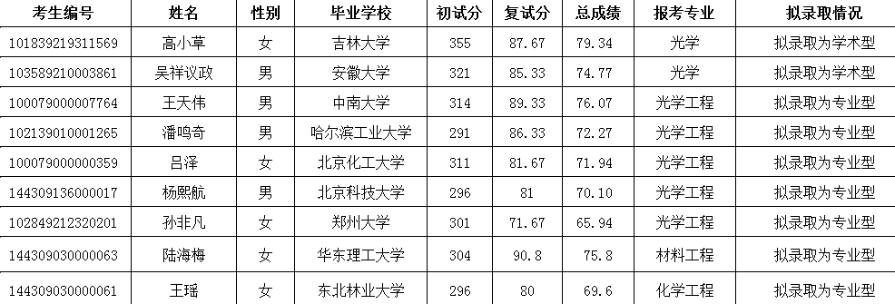经初试、体检、综合素质面试考核,我所决定拟录取以下9名调剂考生为理化所2019级硕士研究生。现将拟录取考生名单公示如下: