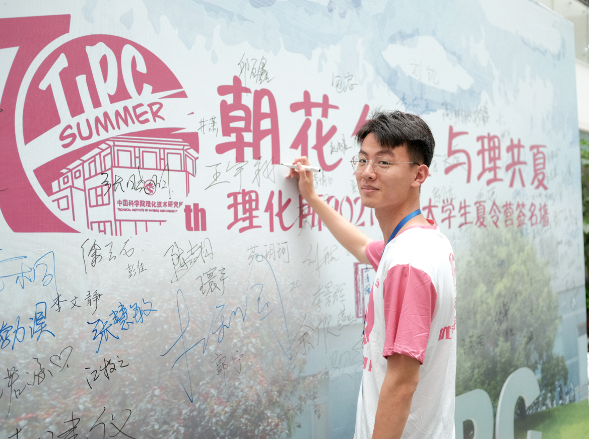 2021年,这趟夏令营“用心之旅”的开始虽然恰逢北京市突降暴雨,但风雨浇灭不了营员奔赴而来的热情,也阻挡不了工作人员翘首期盼的热诚。筹备组工作人员特意安排了接送服务,在地铁口安排专人引导,在微信群中实时交流营员抵京情况,确保每一位营员能够安全准时参加报到。7月12日上午,营员们陆续来到理化所,办理完报到手续后在“朝花夕拾 与理共夏”夏令营十周年签名墙前签字拍照,开启夏令营十年的新篇章,留下属于这个夏天独特的记忆。