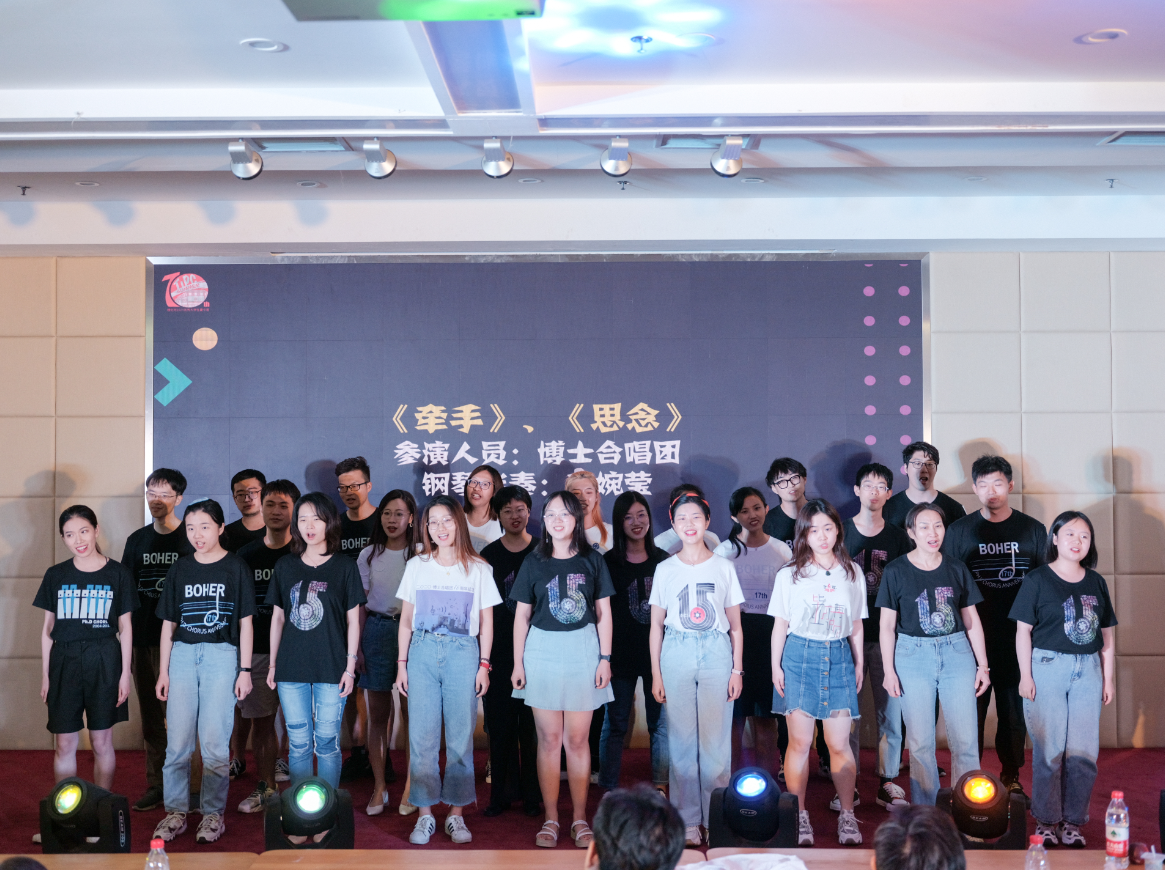 随后,线下各组营员与筹备组成员均带来了精彩纷呈的节目。歌曲节目中,“理化所那年的雨季,有我们共同的期许”“再见了不会再有的十周年,再见了你留给我心目中的科研萌芽”……同学们尝试改编歌曲,在大家熟悉的旋律中,唱着饱含中关村东路回忆的歌词。虽然准备时间只有几日空闲中的十数个小时,同学们依然为大家呈现出幽默的小品节目,诉说内心乐学热情。也有同学积极展示才艺,以二胡独奏奏响国粹,引起现场掌声不断。中场环节,在场营员们积极参与互动小游戏,场上选手竞争激烈,场下观众跃跃欲试。晚会最后,博士合唱团献唱《牵手》、《思念》,歌声婉转动听,全场观众无不陶醉其中;伴随着悠扬的曲调,晚会圆满落幕。
