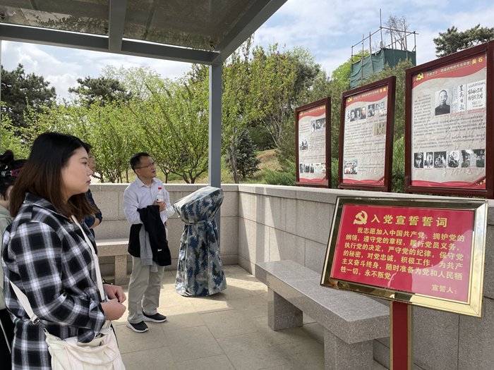 支部书记贺军辉同志带领大家来到广场二层无名英雄代表吴石、朱枫、陈保仓、聂曦的事迹展览前,共同回顾先烈们的生平事迹,学习他们对党绝对忠诚、敢于牺牲的革命精神。在二层广场左侧花岗岩墙壁上的精制铜版上,镌刻着这样一段铭文:因为皈依信仰,坦然面对生死;因为心怀大爱,无悔血沃中华。中共地下党员蒋碧玉面对保密局特务平静地说:我们难逃一死,但是,我们能为伟大的祖国、伟大的党在台湾流第一滴血,我们将光荣地死去!这是对英雄们大无畏牺牲精神的最好诠释。