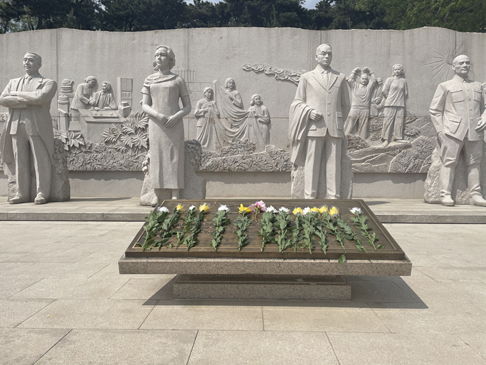 接着大家一起来到二层广场中央,面向英雄浮雕举行默哀、献花仪式,一朵朵纯洁的菊花寄托了对先烈的无限哀思。大家缓步走下台阶,心里默念着花岗岩墙壁上镌刻着的846位当年牺牲于台湾的烈士的英名。随后,大家来到镌刻有毛主席题诗的巨幅景观墙前面,不约而同朗诵起主席的题诗:"惊涛拍孤岛,碧波映天晓。虎穴藏忠魂,曙光迎来早",再次表达对先烈们的崇高敬意。