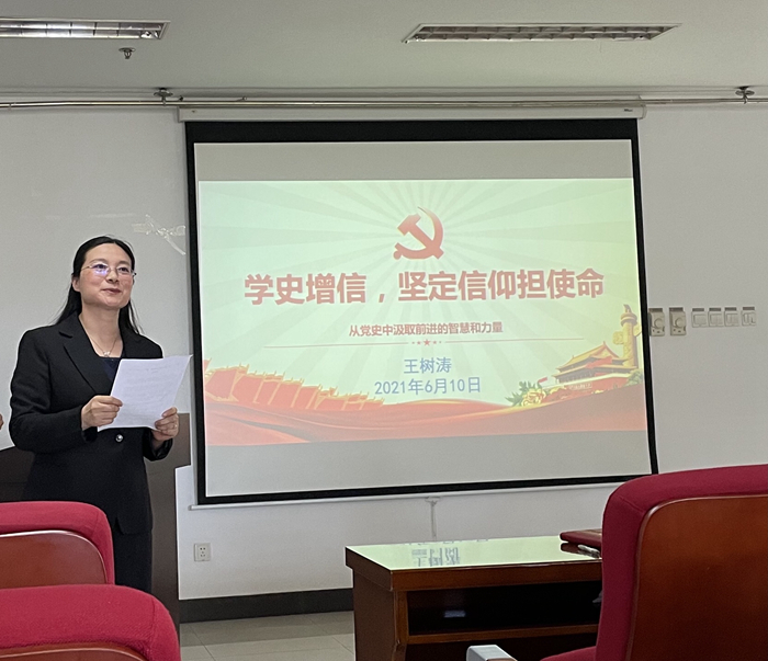 王树涛委员作了主题为《学史增信,坚定信仰担使命》的党课报告,指出今年是建党100周年,党史是教科书,也是营养剂,我们必须把党的历史学习好、总结好。站在“两个一百年”奋斗目标的历史交汇点,开展党史学习教育,正当其时。报告中,王树涛带领大家认真学习了党史学习教育活动的必要性和重要意义,图文并茂地讲述了新民主主义革命时期历史,内容涵盖了中国共产党创立的历史条件,中国共产党的创立,第一次国共合作与北伐战争,中国特色革命道路的开辟,延安整风与党的团结统一等内容,对重要历史节点进行了深入剖析,深刻诠释了中国共产党在国家历史发展中所起的中流砥柱作用。