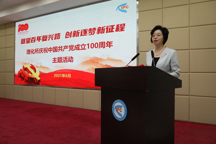 理化所党委书记张丽萍做主题讲话。讲话分为三个部分。一是中国共产党百年历史创造了彪炳史册的丰功伟绩,谱写了人类历史上感天动地的壮丽史诗。二是与祖国同行,与科学共进,中科院书写了新中国科技创新辉煌篇章。三是理化所组建20余年,走出了一条独具特色的发展之路,做出了无愧时代的重大贡献。
