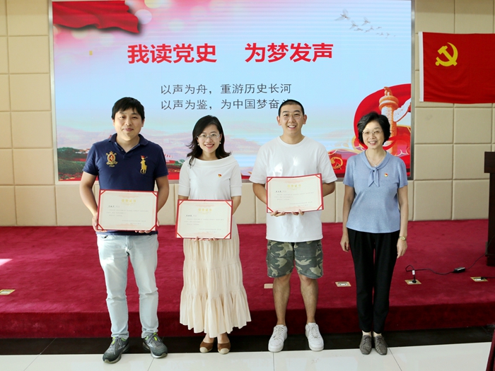 会议最后是“我读党史,为梦发声”活动颁奖环节。为加强党史学习,为建党百年献礼,支部举办了“我读党史,为梦发声”党史学习教育特色活动。此次活动以党小组为团队展开接力赛,发动支部每一位党员和群众,历时35天,完成了《中国共产党简史》全书各章节重点内容的音频编辑及展示。活动中涌现出一批好声音、好创意、好编辑,最终评选出“十佳读史人”和三位“好声音编辑人”。