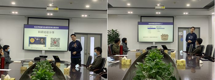 会议特别邀请超分子光化学研究中心党支部书记施润与大家分享成长经历和科研经验。施润的报告从个人能力和团队协作两个方面切入,结合自己的成长经历,探讨了科研中的“拿来主义”,在科研中要掌握属于自己的“绝活”,并活学活用,解决关键问题,把一个点做到极致。对于科研能力的培养,他建议大家走出舒适圈,挑战新事物,养成良好科研习惯,提高学术表达能力;在团队协作方面,要积极主动,多为团队做贡献。分享结束后,大家踊跃提问,并展开热烈讨论。
