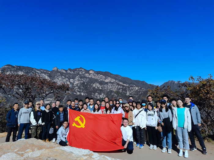 上午9点,党支部成员在坡峰岭山脚下集合完毕。虽然经历了近一个半小时的较长车程,但是大家依然兴致高昂,跃跃欲试。初登山时,拾级而上,蜿蜒小路两侧植被簇拥,淡黄与褐红色的树叶之间洒落下一束束阳光,温和中微带寒意,大家有说有笑,气氛十分热闹融洽。渐渐地,沿路逐渐曲折,坡度愈发陡峭,大家的速度明显慢了下来,但是没有人轻言放弃,大家相互鼓励,没有一个人掉队。稍作休息后,大家都毫不犹豫地选择继续向顶峰进发。越向上攀登,景物越发清疏爽朗,大家的心情也跟着舒展。整个过程中,大家充分发挥了勇往直前、坚忍不拔、团结互助、克服困难的党员精神。最终,历经大约一个半小时的时间,党支部全体成员到达山顶,并合影留念。