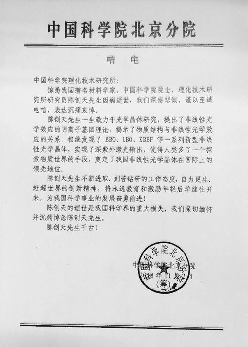 中国科学院北京分院唁电
