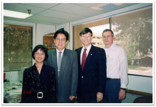 陈创天(左二)在斯坦福大学与国际著名激光专家Byer教授(左三)