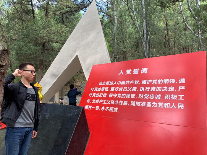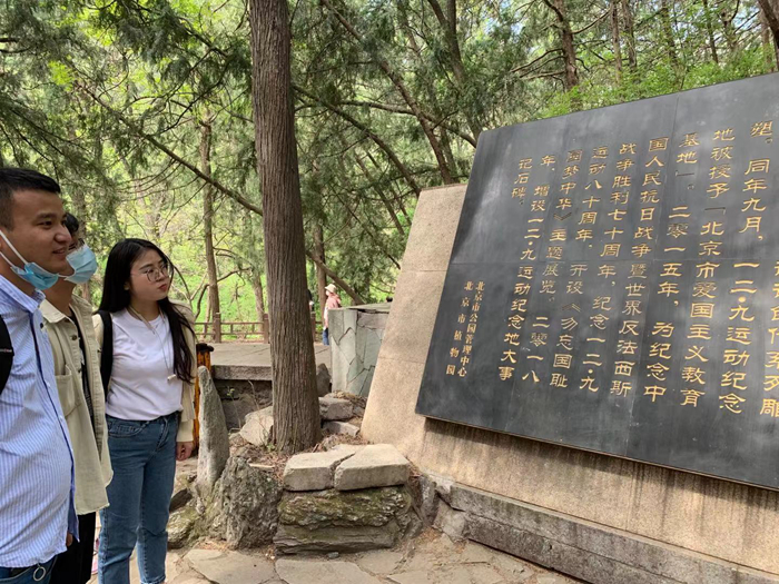 沿着林间小路拾级而上,“一二·九”运动纪念碑静静地伫立在“保卫华北”石刻对面,八个鎏金大字是峥嵘岁月的掠影。党员们认真观看了“一二·九”纪念碑前的展板内容,深入了解到在中华民族处于生死存亡的危急关头,“北平学联”开展了一系列抗日救国运动,在全国掀起了抗战新高潮。重温那些在党的百年伟大奋斗历程中发生的动人故事,党员们更加深刻地领悟了“不忘初心、牢记使命”的真正内涵。