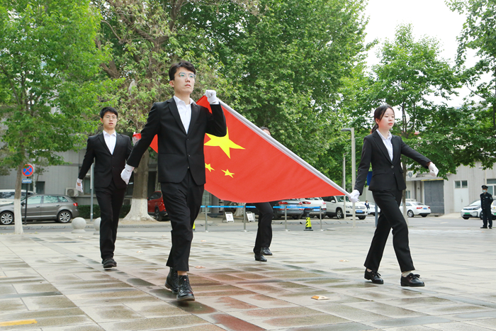 在雄壮激昂的进行曲中,护旗手林明嫱、焦珂欣、刘子尧和潘子杰迈着铿锵有力、整齐划一的步伐护送国旗来到旗杆下,把国旗庄重地交入升旗手李显和郑茂文手中。伴随着庄严的国歌,升旗手郑茂文振臂一挥,鲜艳的五星红旗徐徐展开。在全体师生的注目礼下,五星红旗冉冉升起,迎着初升的太阳飘扬在理化所上空。