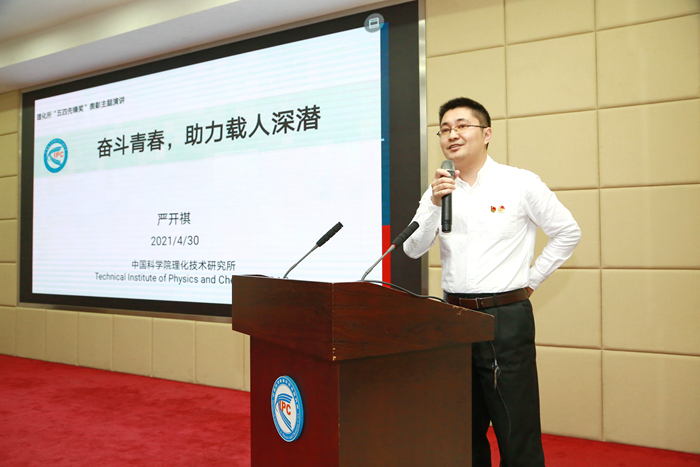 颁奖仪式后,中国青年五四奖章获得者严开祺、理化所“五四先锋奖”获奖团队及个人依次发表了主题演讲。严开祺以《奋斗青春,助力载人深潜》为题,鼓励青年人脚踏实地、志存高远。 激光物理与技术研究中心系统联调测试团队代表尹凯欣分享团队成员在保障测试完成中做出的突出贡献。液态金属与低温生物医学研究中心王倩以科研青春和党建工作两条主线分享自己的成长经历。降解塑料与工程塑料研究组卢波分享个人在积极促进海南共建项目落地以来的心路历程。人工晶体研究发展中心刘旺的分享生动展现了青年学生干部的责任与担当。综合处朱世慧以个人和家庭成长故事为中心,鼓励青年人要不怕吃苦、勤于奉献。超分子光化学研究中心施润,以亲身经历劝勉青年科研工作者沉下心来,去除浮躁。