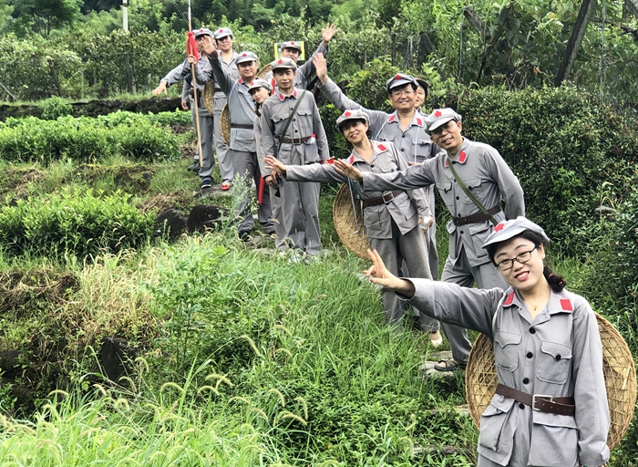 随后,大家来到庙下乡长生桥村,身着红军衣,重走红军道。由于受台风的影响,特影支部到达时,风雨时骤时停,行走在泥泞曲折的乡间小道,大家身临其境地体验到了中国工农红军的艰辛,对革命先贤的敬佩和感恩之心油然而生。这次重走红军古道的活动,使大家深刻体会了习近平总书记在《论中国共产党历史》中指出的,面对美好岁月,要有饮水思源、懂得回报的感恩之心。途中,大家还参观了中共闽浙赣省委城工部龙游支部旧址。