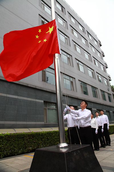 在雄壮激昂的运动员进行曲中,护旗手郭斌、赵俊、刘冉和贾倩倩迈着整齐的步伐,护送五星红旗入场,把国旗庄重地交到升旗手严开祺和王平手中。在庄严的国歌声中,全体师生行注目礼,鲜艳的五星红旗冉冉升起,飘扬在理化所广场上空。