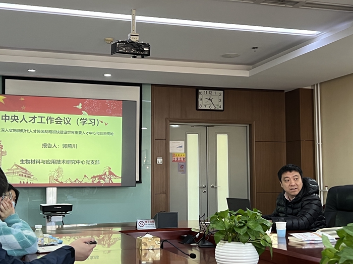 11月30日,生物材料与应用技术研究中心党支部召开党员大会,集体学习十九届六中全会要点、习近平总书记在中央人才工作会议上的讲话精神,开展“弘扬科学家精神”主题学习活动以及“保密有我”主题党日活动。支部组织委员卢伟鹏主持会议。