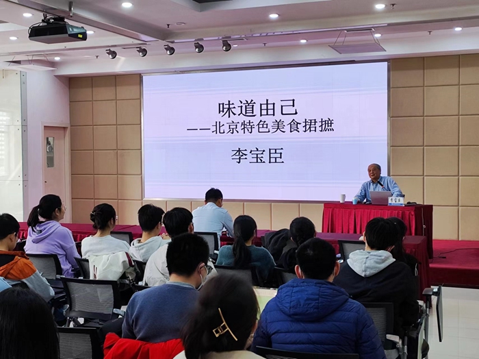 李宝臣研究员从题目入手,强调味道取决于自己的主观感受,需戒耳餐。他介绍了烹饪技法演进的五个阶段:烧、煮、蒸、炸、炒。在每个烹饪阶段,李宝臣会列举出相应的美食作为载体,并穿插制作技巧,讲解背后的历史文化知识。之后,他分享了烹饪技法的五标准:选料准、投料狠、刀工细、搭配当和火候准,并用鱼香肉丝这一大家经常吃的菜为例对每一项进行了详细的说明。他还介绍了几类旧日专营饭食之所,即:堂字号、饭庄、冷庄子、私家菜、小馆、街头食摊等。最后,李宝臣从北京特色美食延伸到了中国的饮食文化,向大家阐述了宴会座次与上菜程序,以及饭局礼仪,让同学们体会到源远流长的中华文明和浓浓的人文情怀。