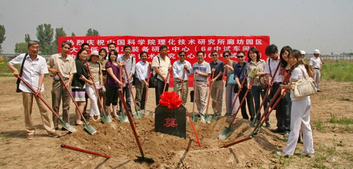 随后,礼炮齐鸣,彩烟凌空,各方来宾共同挥锹铲土为廊坊园区大型低温制冷装备研究中心(6#楼)和功能晶体与激光技术研究中心(10#楼)开工奠基。理化所参加奠基仪式的人员纷纷在奠基石前合影留念,为见证这一研究所发展的重要历史时刻而兴奋和自豪。
