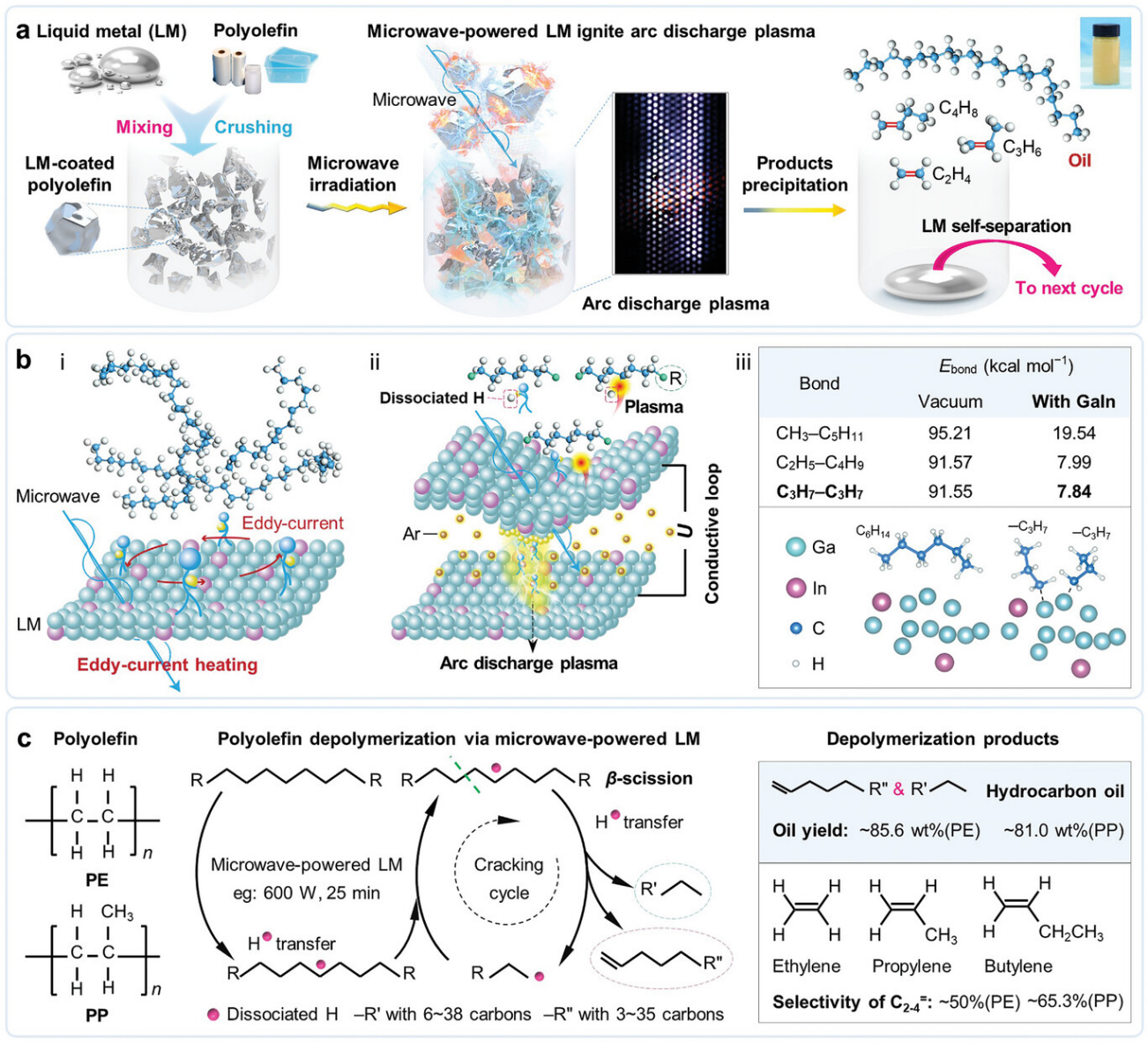 近日,来自清华大学与中国科学院理化技术研究所液态金属研究中心刘静和高建业,油气中心三次采油团队马望京等研究人员,以微波激发液态金属释放高能等离子体为出发点,建构了可实现聚乙烯、聚丙烯塑料的选择性强化解聚策略,获得了显著超越传统解聚方法的产量高、分布集中的碳氢化合物油品(油产率:PE 85.9 wt.%; PP 81.0 wt.%)和烯烃单体(C2-C4烯烃选择性:PE 50%; PP 65.3%) 。此项工作首次提出了液态金属协同电磁微波强化塑料 “选择性” 解聚的方法,为规模化、低能耗回收废弃塑料提供了全新的技术路线。相关成果近日以Microwave-Powered Liquid Metal Degradation of Polyolefins为题发表在Advanced Materials上。该文章通讯作者为清华大学高建业,清华大学和中国科学院理化所刘静,中国科学院理化所马望京。清华大学高建业和中国科学院理化所赵俊为文章共同第一作者。