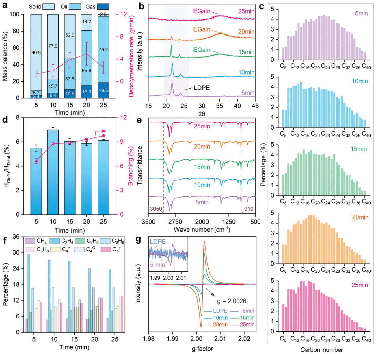 图 2. 液态金属EGaIn触发微波等离子体驱动的聚乙烯塑料解聚过程动态刻画。a)不同解聚时间的质量平衡和解聚速率。b)XRD 光谱揭示塑料和液态金属在解聚过程中的结构演变。c)不同解聚时间下油产物的碳数分布。d)使用 1H NMR 光谱得出的不同时间油产物中 HOlefin/HTotal的比例和支化情况。e)FTIR 光谱描绘了不同时间油产物中的官能团变化。f)利用气相色谱法得出的塑料解聚过程中气体成分的时间演变。g)EPR 光谱揭示塑料解聚过程中间体的演变。