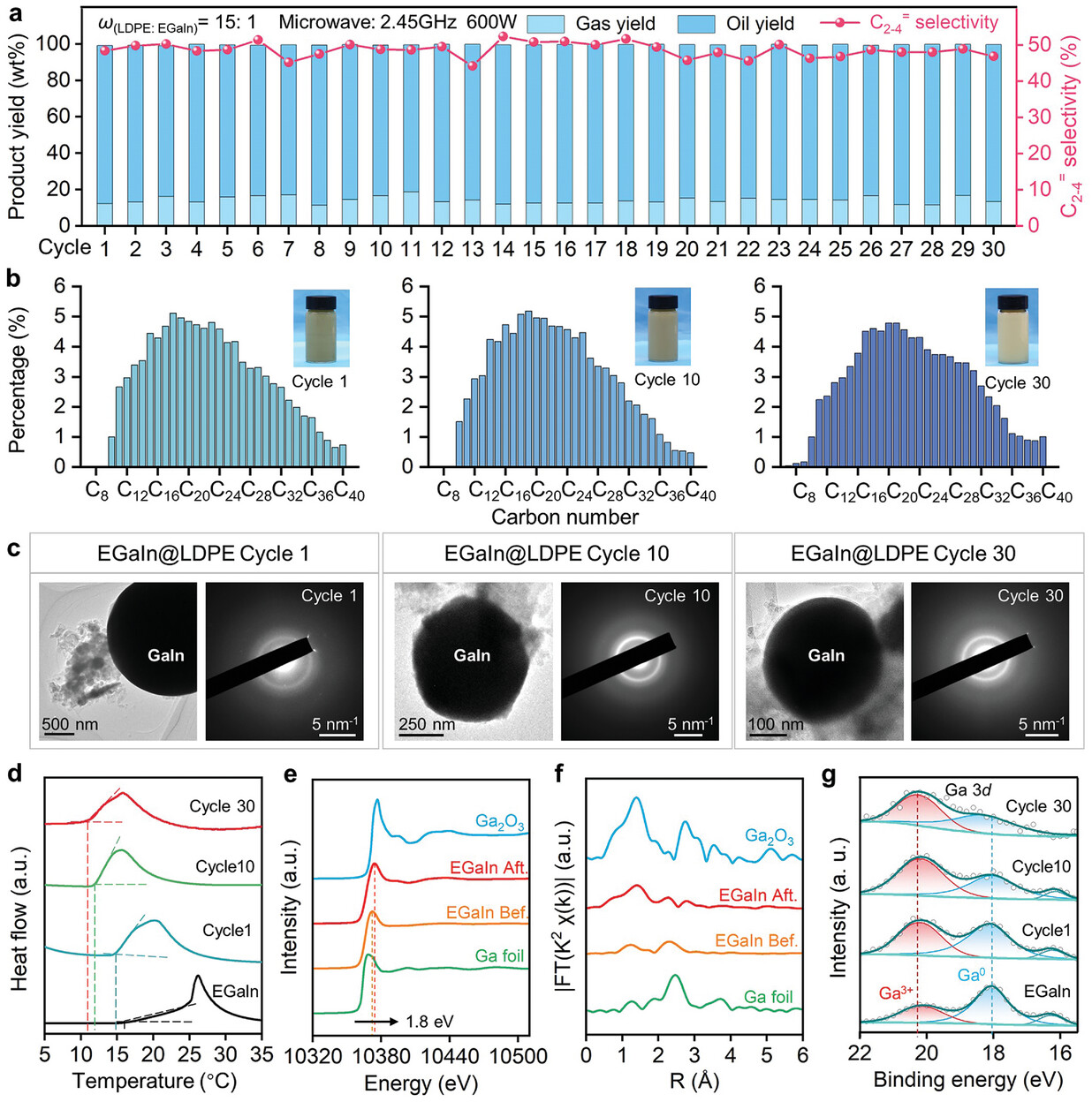 图 3. 液态金属EGaIn触发微波等离子体驱动的解聚低密度聚乙烯(LDPE)的产物分布。a)在 30 个连续解聚循环中的产物产率和烯烃单体C2-4=选择性。第 1、10 和 30 个循环中b)油产物的碳数分布,c)解聚残留物的 TEM 图和 SAED 图。d)DSC 图谱表征不同解聚循环后 EGaIn 的熔点。e)Ga K 边 XAS,f)Ga 箔和 Ga2O3标准样品以及解聚 LDPE 前后的 EGaIn 的 Ga元素K 边 XANES 光谱的傅里叶变换。g)XPS 图谱揭示不同解聚循环后 EGaIn 中 Ga 的价态。