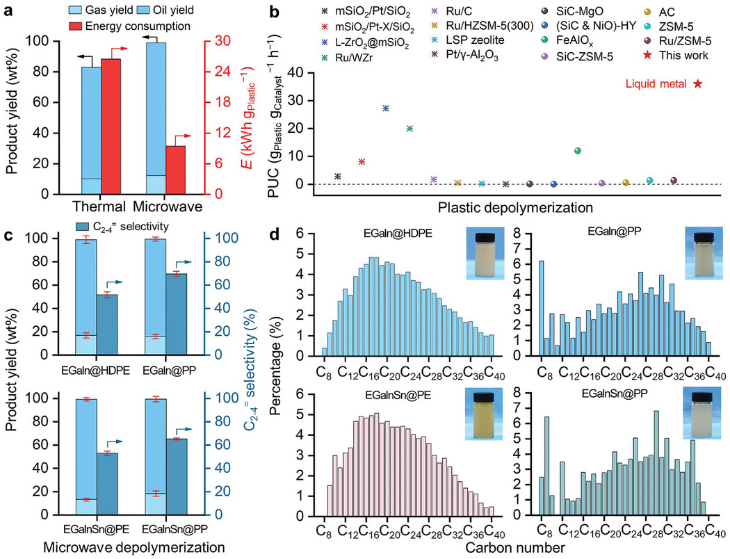 图 4. 微波驱动液态金属解聚技术的有效性和适应性。a)电加热的热解策略与微波驱动液态金属EGaIn 解聚产品产率和能耗的比较。b)塑料升级再造能力对比。c)产品产率、C2 - 4 =的选择性 以及 d)使用不同液态金属对各种聚烯烃塑料解聚时的油产品碳数分布。