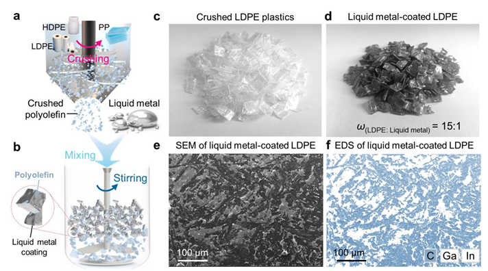 图5. 含液态金属涂层的聚烯烃物料制备。a)聚烯烃的机械破碎过程。b)机械搅拌制备出的含液态金属涂层聚烯烃。C)低密度聚乙烯塑料破碎后实物。d-f)含液态金属涂层的聚烯烃:d)照片;e)SEM图像;f)EDS图像。