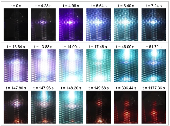 图6. 液态金属激发微波等离子体现象。拍摄过程中使用佳能相机以每秒50帧的速度捕捉到的等离子体产生及演化过程。