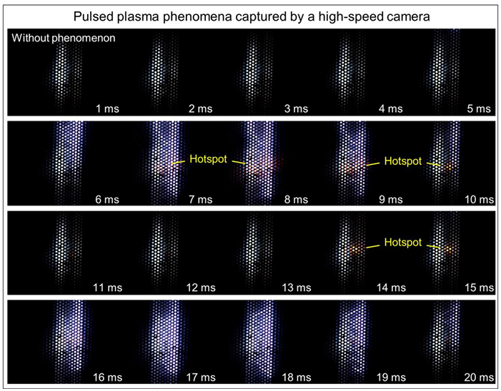 图7. 液态金属激发微波产生的超快脉冲等离子体。使用高速相机以每秒1000帧的速度捕捉脉冲等离子体现象。