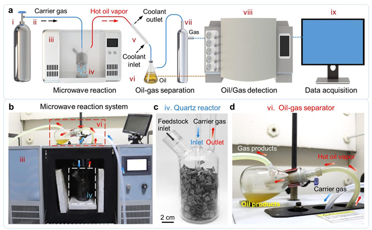 图 8. 实验室级微波驱动液态金属解聚技术装置及系统。a)设备和实验系统示意。从左至右:i)载气储气瓶,ii)管道,iii)微波反应设备,iv)石英反应器,v)冷凝器,vi)油气分离器,vii)气体产物储气瓶,viii)油气检测装置,ix)数据采集设备。b)图a中iii)微波反应器实物照片。c)图a中iv)石英反应器实物。d)油气分离器照片。