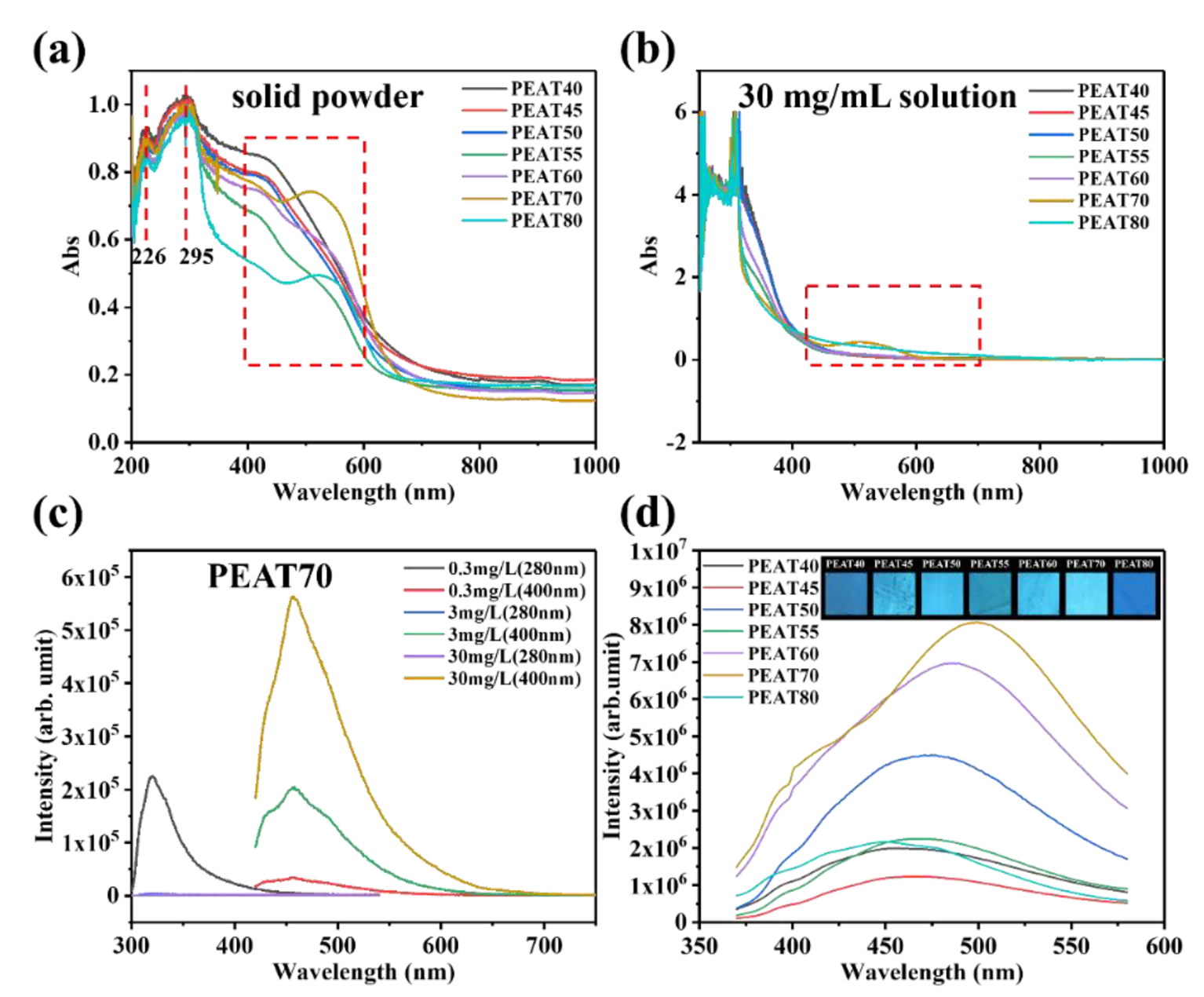 针对上述挑战,研究团队摒弃了单一化学改性的传统思路,创新性地提出了一种协同调控策略。 团队首先在聚对苯二甲酸乙二醇酯(PET)刚性骨架中引入己二酸(AA)调节链柔性。利用聚集诱导发光(AIE)机理,通过高灵敏度荧光光谱技术,对不同配比共聚物的分子间相互作用进行了可视化表征与筛选,最终确定了具有最优分子间非共价相互作用(如π-π堆积)的基体配方(PEAT70)。这种增强的分子间作用力充当了物理交联点,有效补偿了结构改性带来的强度损失。在此高强度基体之上,团队进一步精准植入乙醇酸(GA)或乳酸(LA)作为“降解触发点”,构建出PEATG和PEATL系列共聚酯,使这些位点在水环境中能够迅速诱导聚合物链断裂,从而实现了力学性能与降解速率的最佳平衡