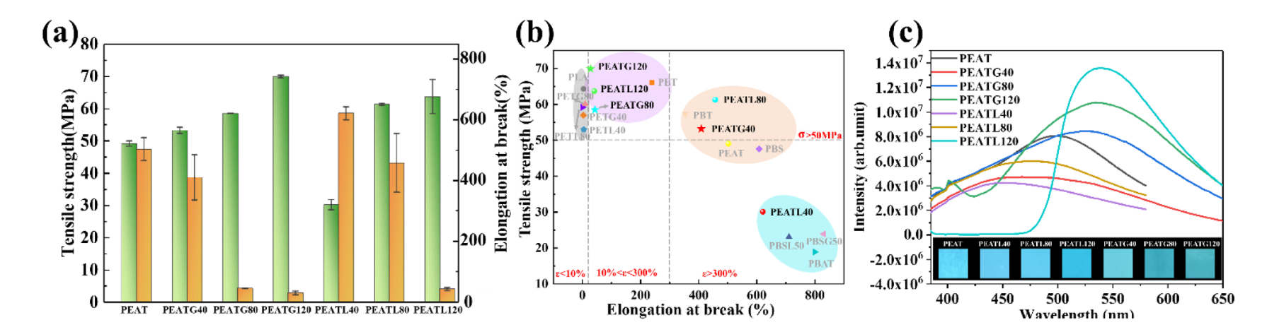 左侧图表(a, b)通过实测数据证实该系列材料力学性能显著优于PBAT等主流商业降解塑料,成功克服了传统改性中“强度大幅下降”的瓶颈;右侧(c)则利用荧光光谱技术,直观揭示了这一性能突破的核心机制,即通过增强分子间非共价相互作用(如π-π堆积)来构建高强度的物理网络。